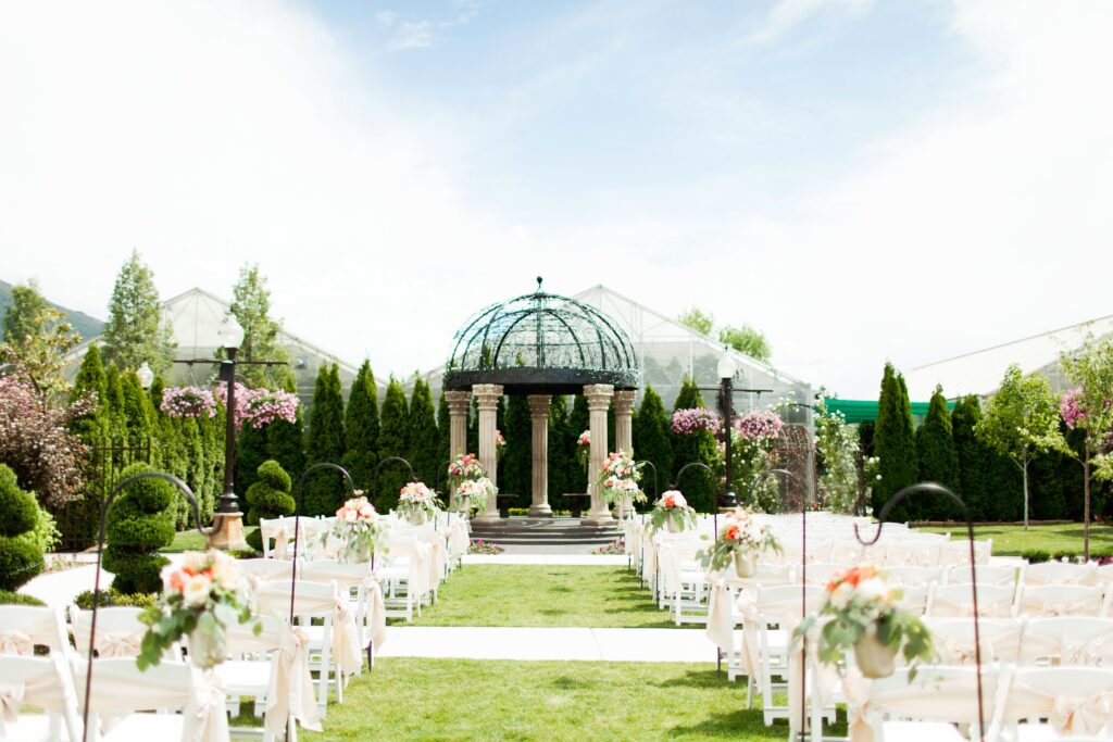 Carry your theme across both spaces — if your hall has gold and blush accents, continue the same tones in your outdoor floral setup.